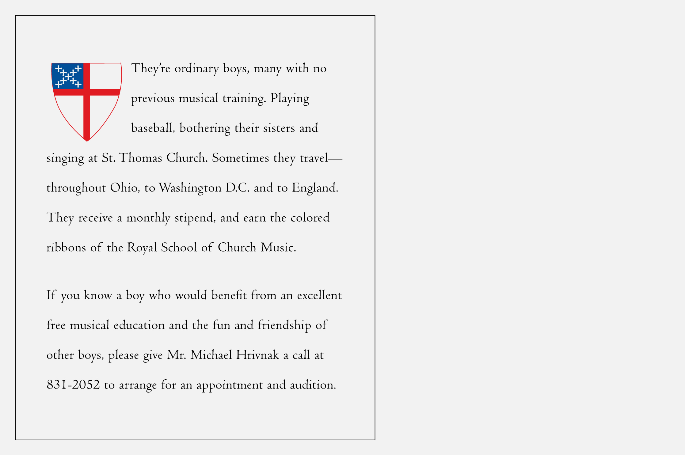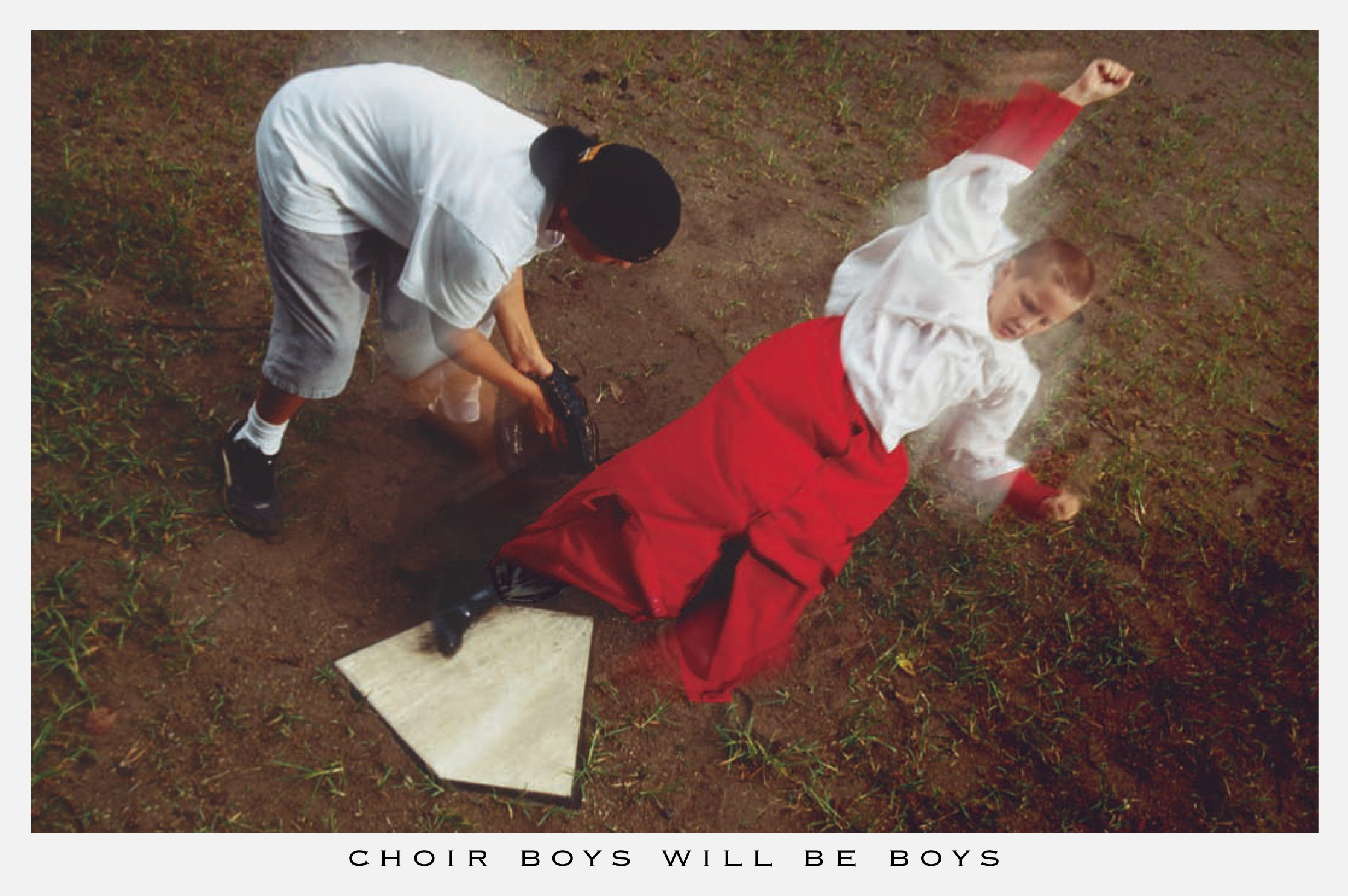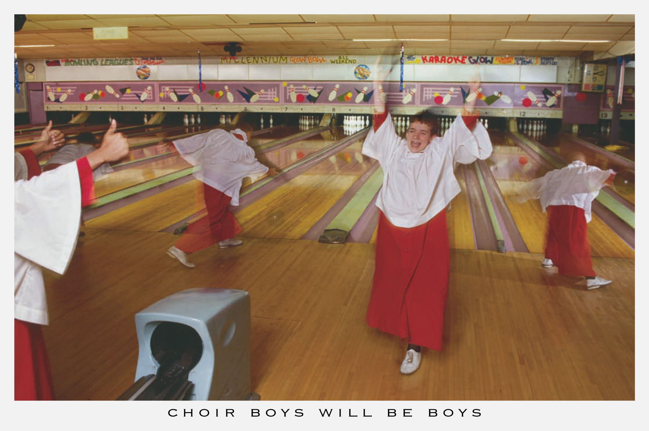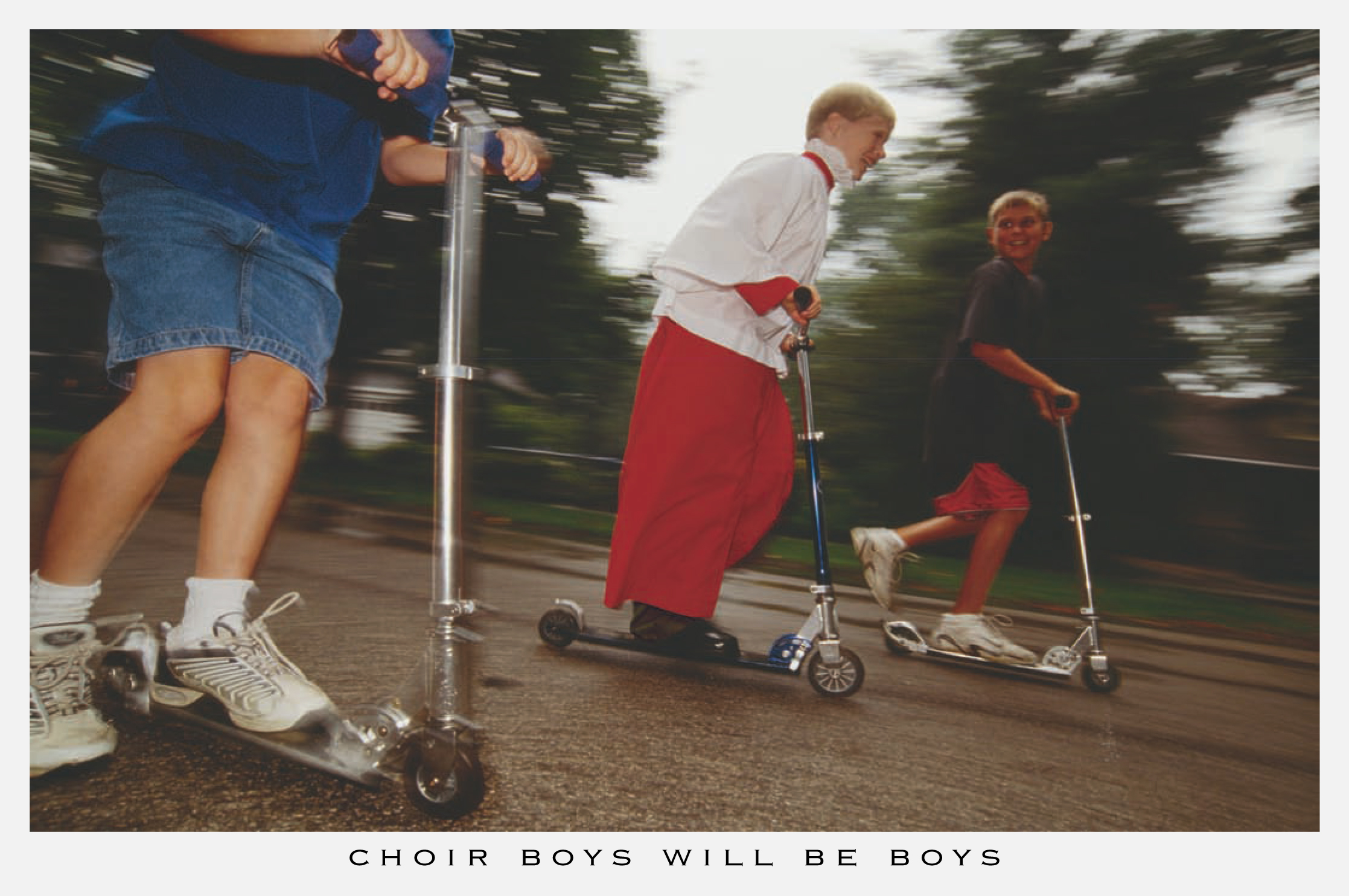 The Episcopal Church has a tradition of robed choir boys singing in their liturgies. Recruiting for the choir can be tough in that some may consider it a bit sissyish. This postcard campaign reassures both boys and their parents that choir boys will be boys.